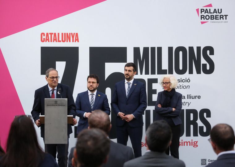 El president de la Generalitat, Quim Torra, acompanyat del vicepresident Pere Aragonès, inaugurant l’exposició Catalunya: 7,5 milions de futurs