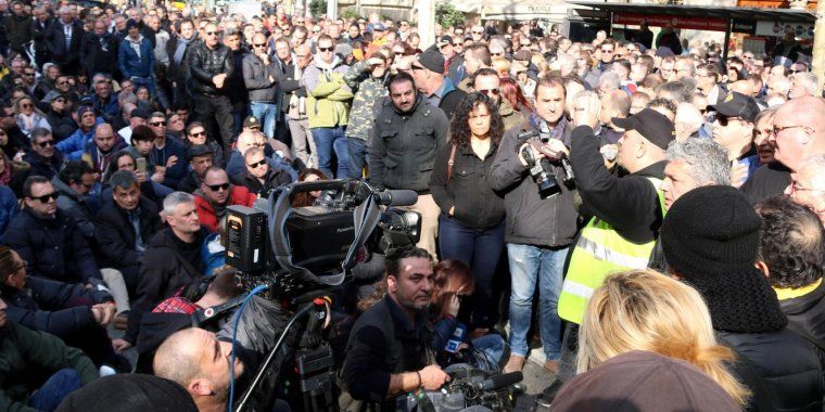 L’assemblea de taxistes dissabte al migdia a Barcelona, amb Tito Álvarez al mig, envoltat de periodistes