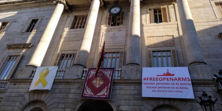 Llaç groc, penó de Santa Eulàlia i pancarta de suport a Open Arms a la façana de l’Ajuntament de Barcelona