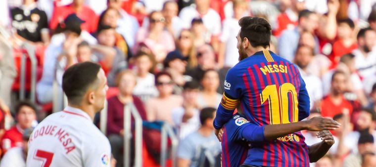 Messi celebra amb Dembélé el tercer gol del seu compte particular al Sánchez Pizjuán